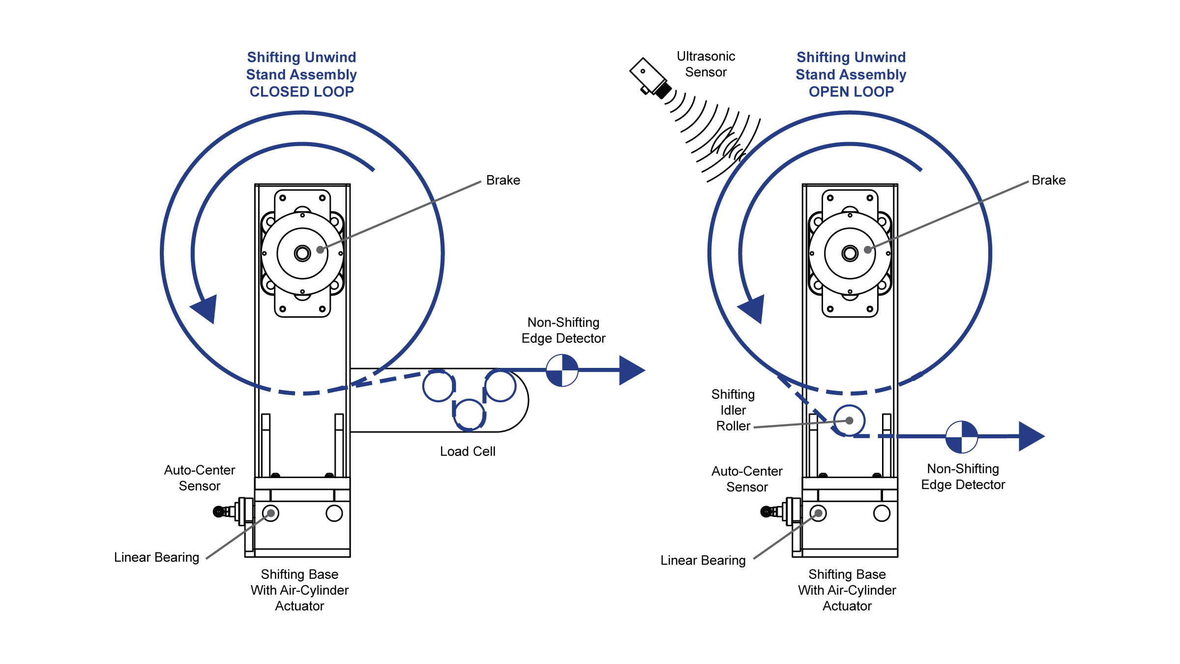 - At least one fixed idler roller is attached to – and moves in unison with the unwind stand to keep the material on a constant plane through the air-flow sensor as the diameter of the unwinding roll decreases.